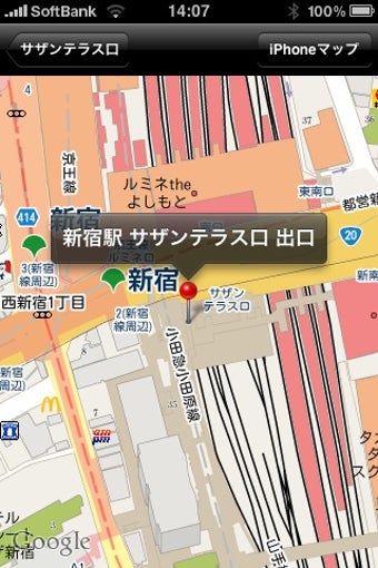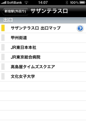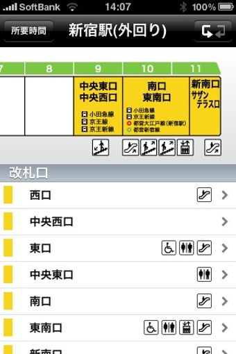 ホームの図の下には、改札口のリストがあり、エスカレーター・トイレ・車いすトイレの有無などがアイコンマークで表示されています。改札口をタップすると、別画面が現れ、乗り換えができる路線や、バス停・タクシー乗り場の有無、そして周辺のランドマークの名前も表示されます。地図を選択するとGoogleマップが開き、駅の周辺の地図を確認することができます。ただし、駅内の地図はありません。